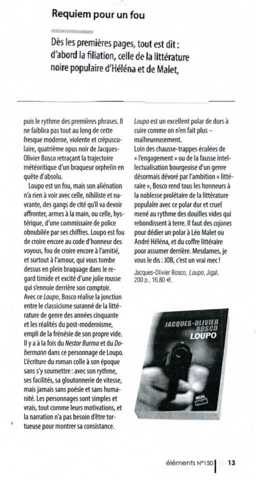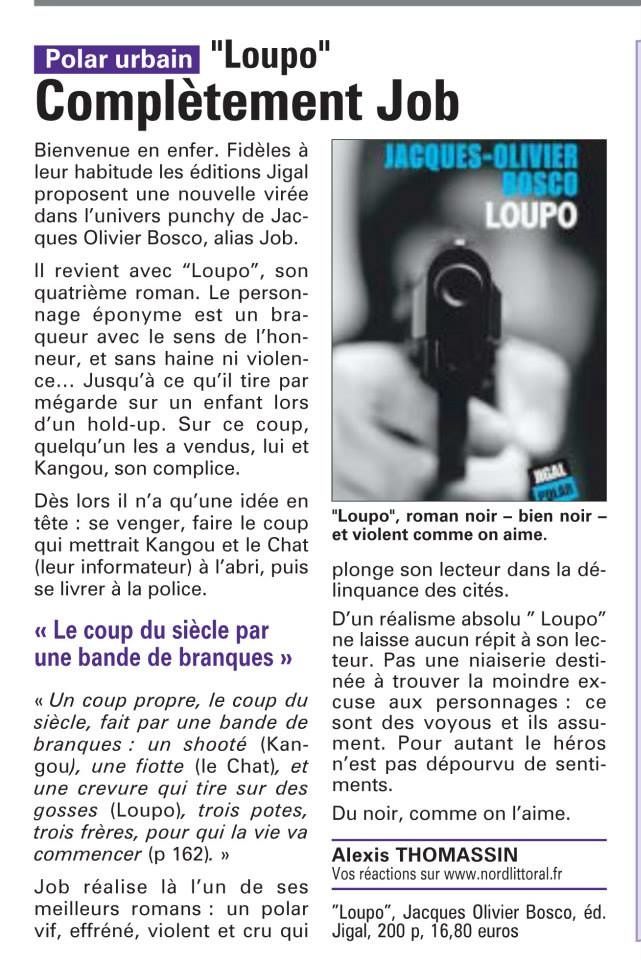 D’une écriture acérée, cadencée par des phrases courtes au langage oral dominant, Jacques-Olivier Bosco nous entraîne à la suite de Loupo dans le monde du banditisme, où les amitiés et les trahisons sont très fortes. Pas de fioritures inutiles dans le style, pas de femmes pour la tendresse ou si peu… De temps à autre, quelques bribes plus poétiques… Il y a surtout des hommes, durs, bruts de décoffrage, qui ont souffert et qui ont fait le choix d’avancer toujours, quel que soit ce qu’il se passe…